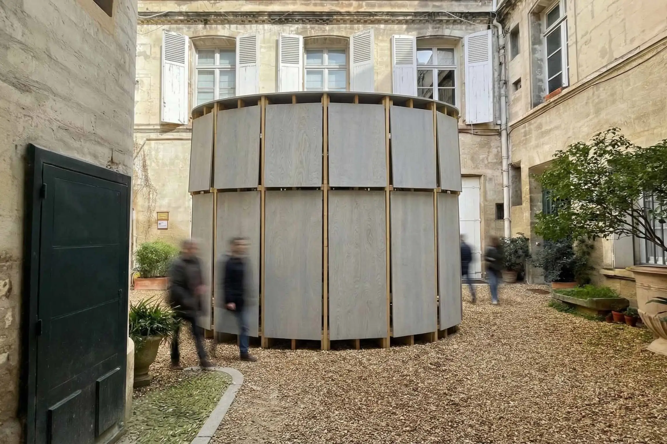 Cette architecture éphémère donne forme à la notion de transmission en créant un lieu de rassemblement. La figure du cercle, autonome et unificatrice, ancre le projet dans le lieu. Un sol surélevé marque le seuil ; à l’intérieur, l’espace invite sans prescrire. On peut s’asseoir, parler, se taire, regarder ou simplement être là. Les portiques de bois élancés, affirmant leur tectonique et portent une enveloppe immatérielle traversée par la lumière. En son sein, le pavillon abrite une colonne de pierre autour de laquelle se déploient les portiques, le plancher s’ouvre pour l’accueillir. Montée à sec avec des fragments inégaux, elle ne tient que par le bois qui la ceinture, tandis qu’elle soutient la toiture qui la comprime. Elles se tiennent l’une l’autre, fragiles et nécessaires, à la manière de deux êtres qui ne subsistent que par leur entente. La colonne apparaît déjà comme une ruine, belle d’avoir renoncé à durer.