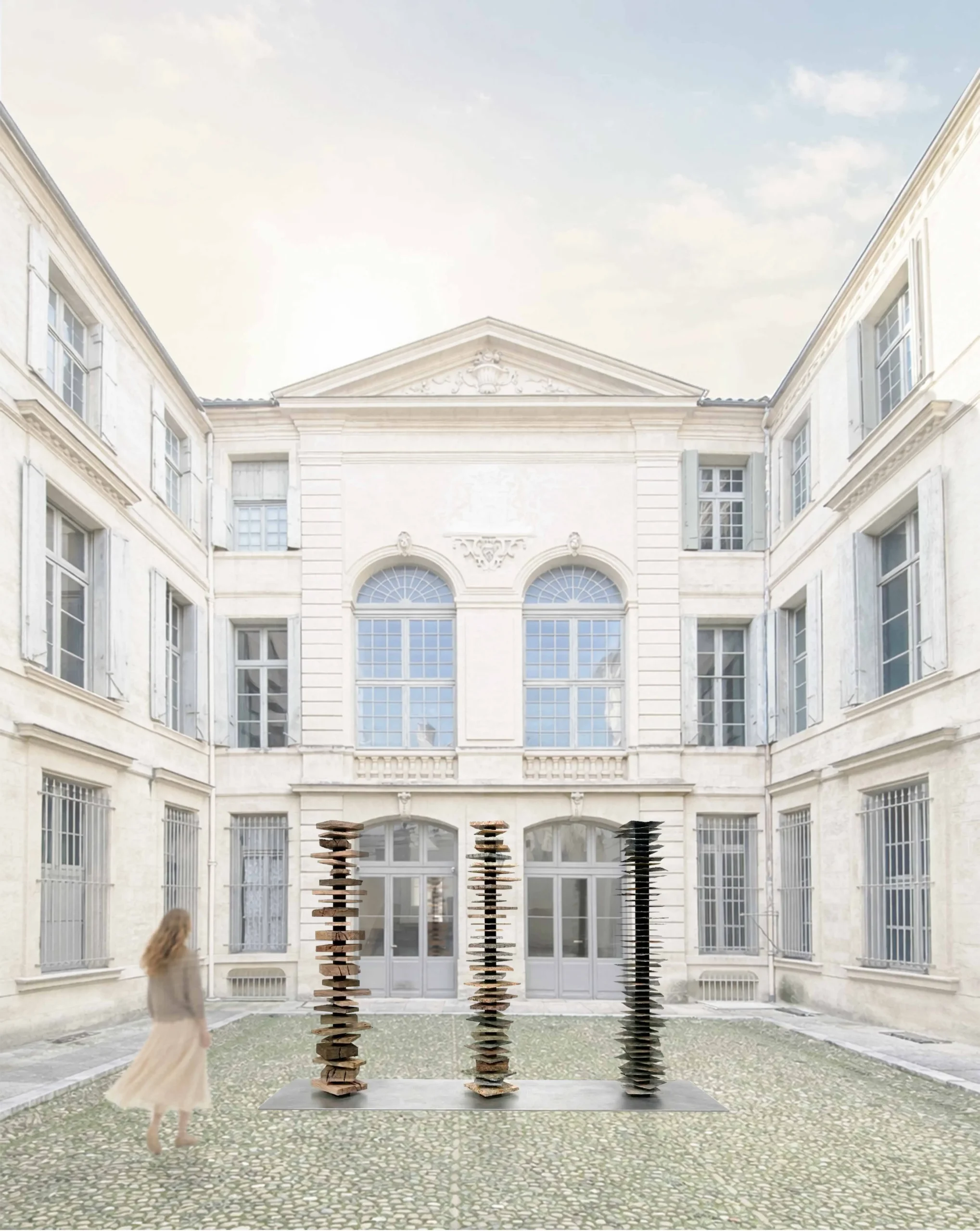 L’installation se compose de trois piliers : pierre, métal et bois. Chaque pilier est unique. Il raconte une histoire qui lui est propre, mais dialogue avec les deux autres par ses proportions, sa proximité et son principe de stratification. Par la superposition brute des matières, ils révèlent textures, veinages et contrastes, érigeant le réemploi en manifeste architectural.