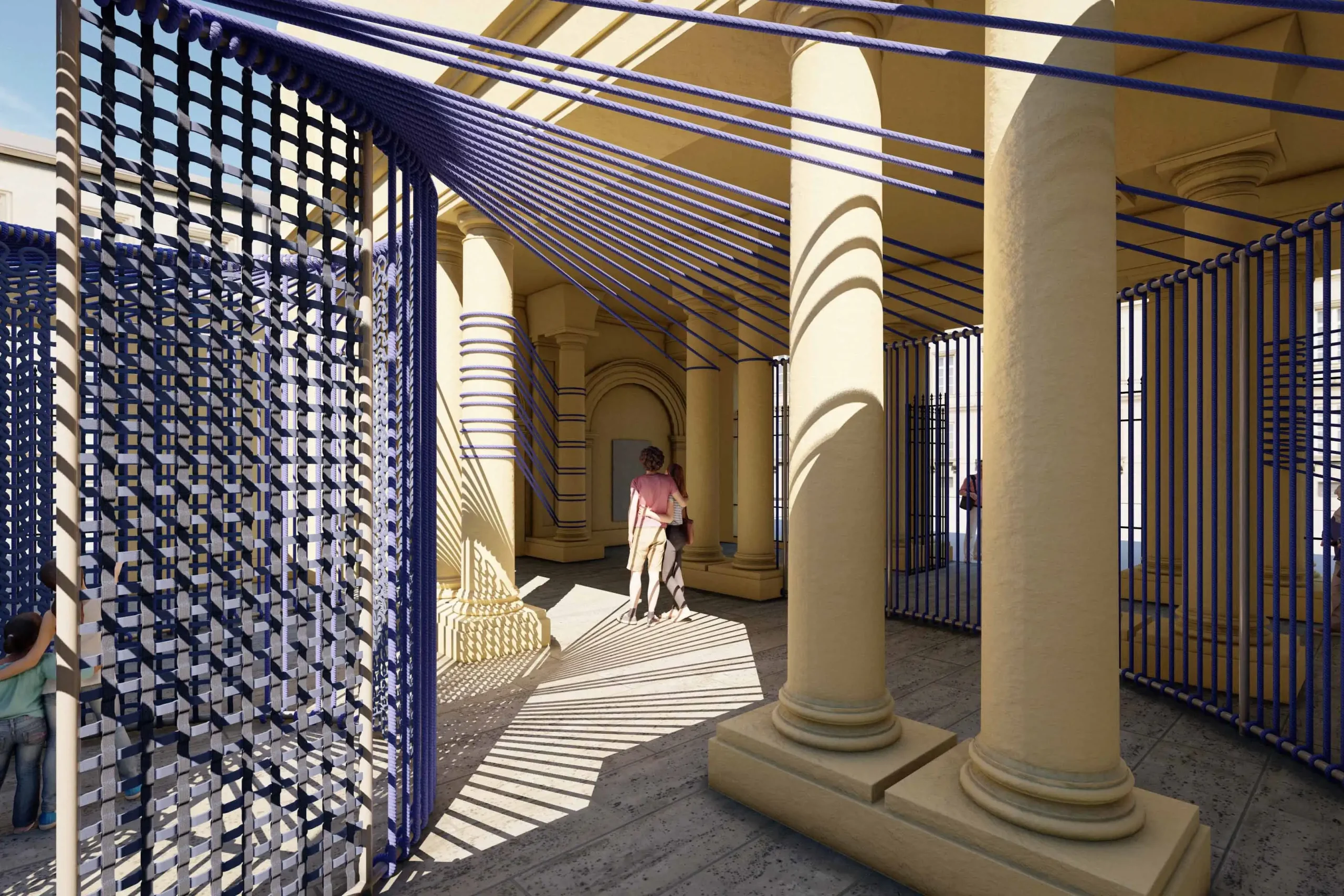 Les colonnes deviennent ainsi des lisses monumentales guidant un entrelacs de fils bleus. Depuis la rue, une trame dense attire le regard ; à l’intérieur, deux cylindres imbriqués structurent le parcours. Le premier, composé d’un tissage de fils, joue avec la lumière et le ciel. Le second est constitué de tressages réalisés à partir de chutes de toile denim, matérialisant le passage du fil à la matière.